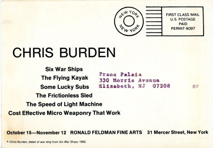 Chris Burden, “Six War Ships” (1982), Card, Ronald Feldman Fine Arts, c. 1982