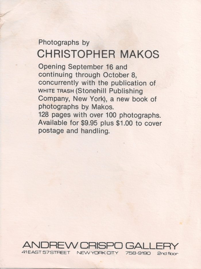 Christopher Makos, Andrew Crispo Gallery, White Trash Book Release, Card, 1977