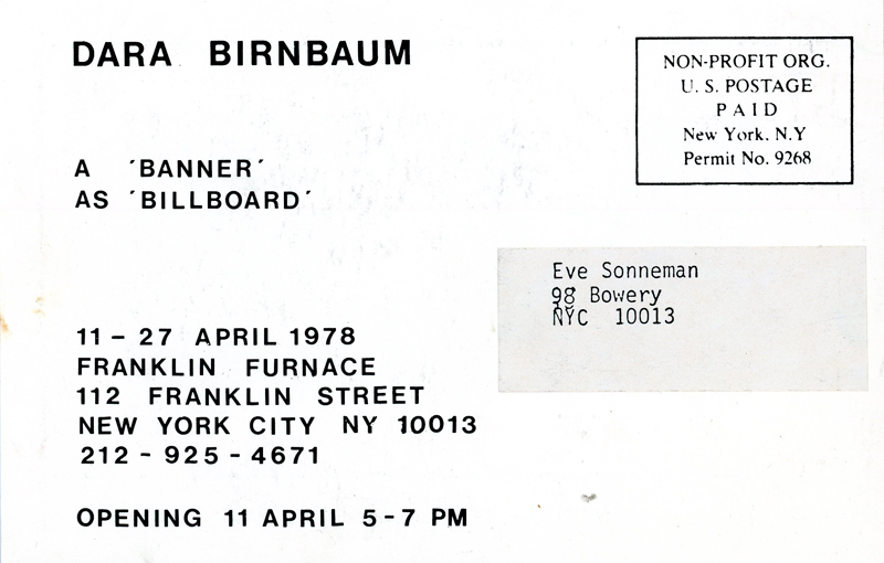 Dara Birnbaum, A ‘Banner’ as ‘Billboard’, Card, Franklin Furnace, 1978