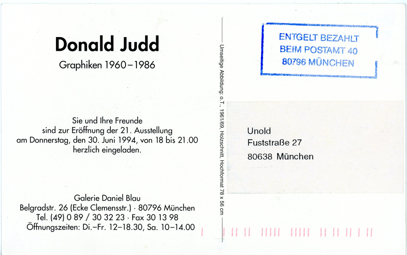 Donald Judd, Card, Daniel Blau Gallery (Munich), 1994