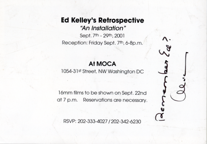 Ed Kelley, An Installation Retrospective, MoCA (Washington DC), With Note by Alice Denney, Card, 2001