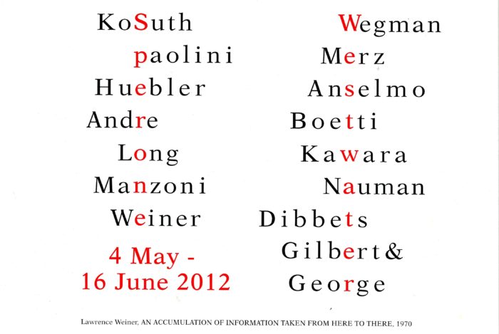Group Show, An Accumulation of Information Taken from Here to There, with Lawrence Weiner, Joseph Kosuth, Alighiero Boetti, On Kawara, and Others, Card, Sperone Westwater Gallery, 2012