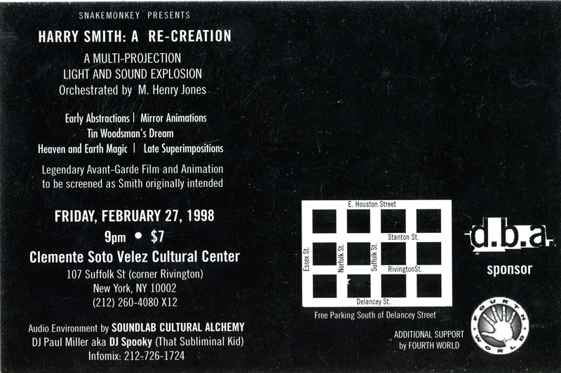 “Harry Smith: A Re-Creation,” Multi-Projection Light and Sound Explosion Orchestrated by M. Henry Jones, Card, Clemente Solo Velez Cultural Center, 1998