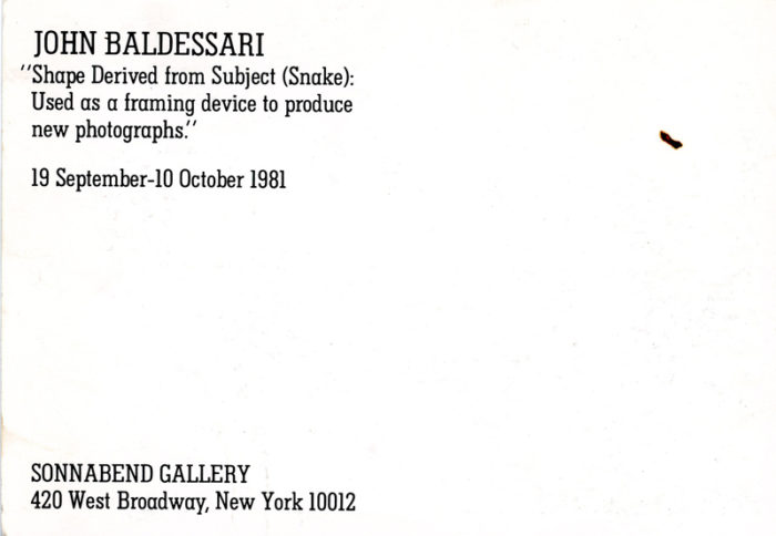 John Baldessari, Shape Derived from Subject (Snake), Card, Sonnabend Gallery, 1981