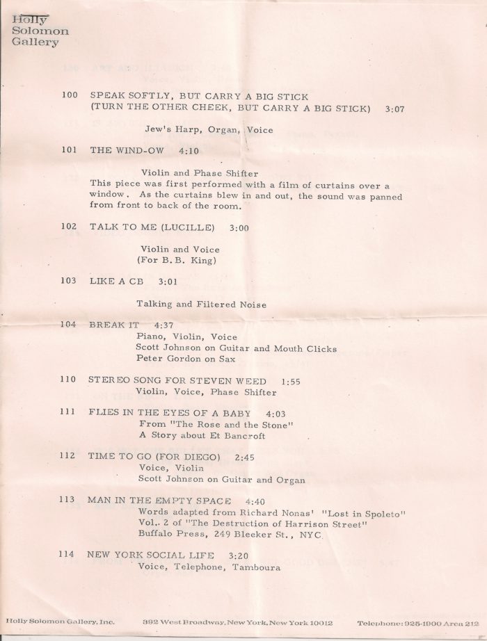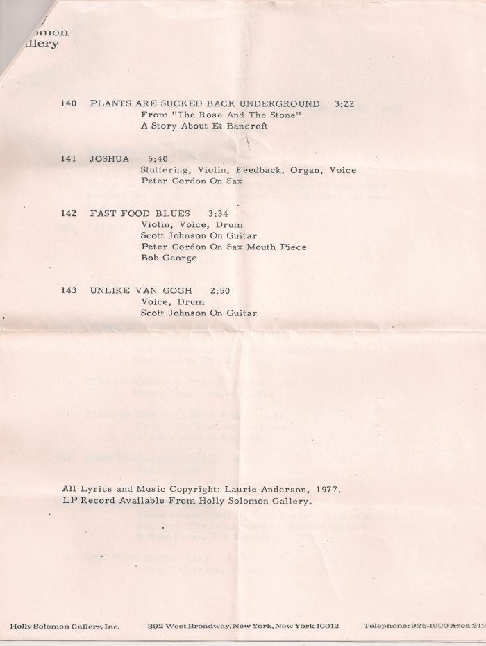 Laurie Anderson, Two-Page Checklist, Holly Solomon Gallery, 1977