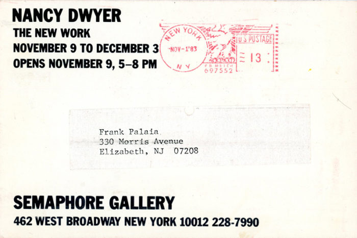 Nancy Dwyer, Card, Semaphore Gallery, 1983