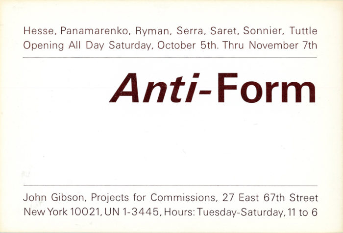 Projects for Commissions: Anti-Form, Group Exhibition with Alan Saret, Keith Sonnier, Richard Tuttle, and Others, Card, John Gibson Gallery, 1968