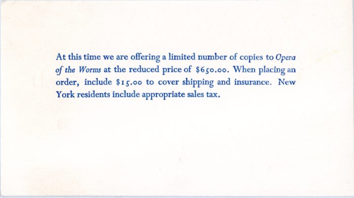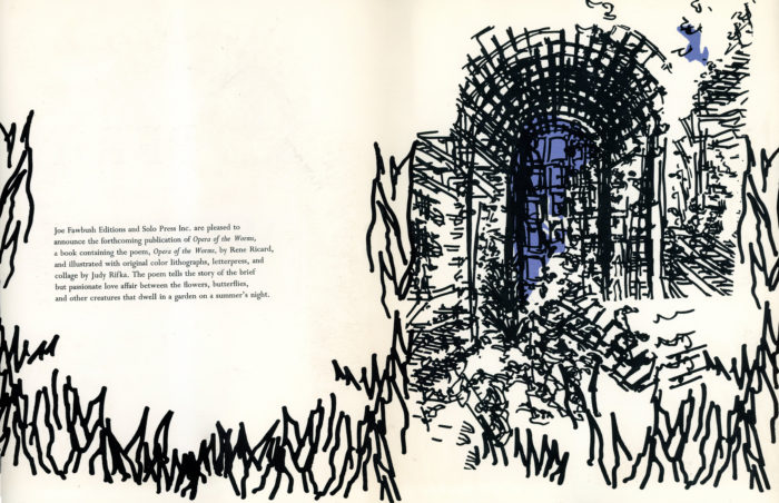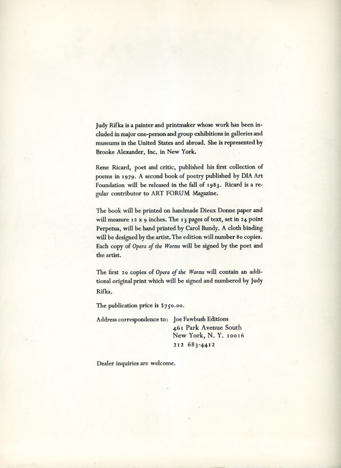 Announcing the publication of the poem Opera of the Worms by Rene Ricard with original color lithographs, letterpress, and collage by Judy Rifka.