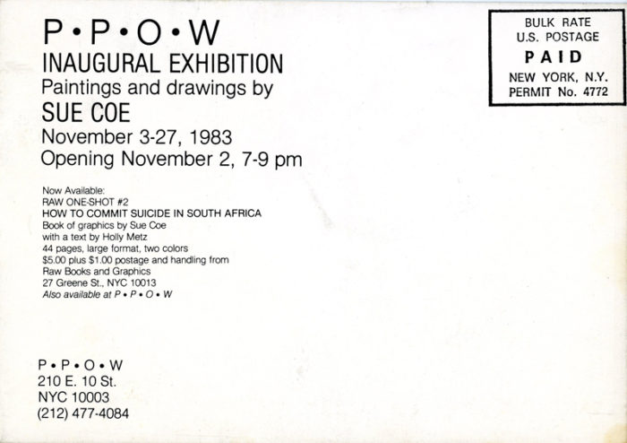 Sue Coe, Inaugural Exhibition at PPOW, Card, 1983