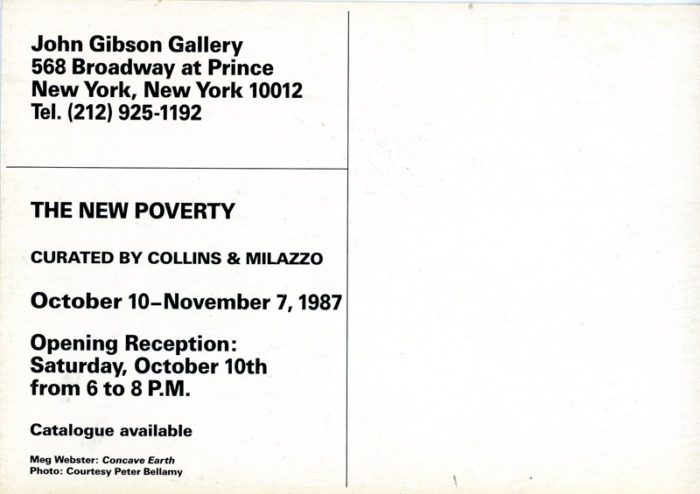 The New Poverty, Group Show with Meg Webster, John Dogg, Michael Zwack, and others, Curated by Collins & Milazzo, Card, John Gibson Gallery, 1987