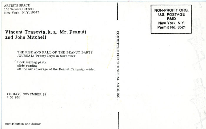 Vincent Trasov (a.k.a. Mr. Peanut), John Mitchell, The Rise and Fall of the Peanut Party Journal, Card, Artists Space, 1976