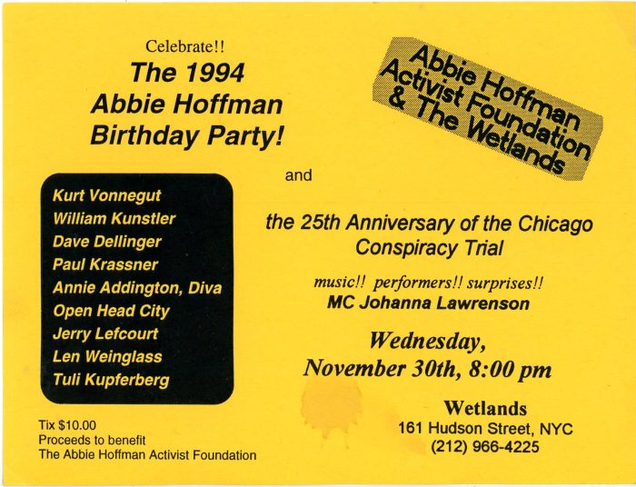 Abbie Hoffman, Birthday Party Celebration and the 25th Anniversary of the Chicago Conspiracy Trial, Invitation Card, Wetlands, 1994