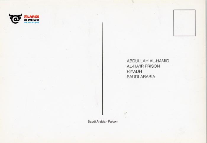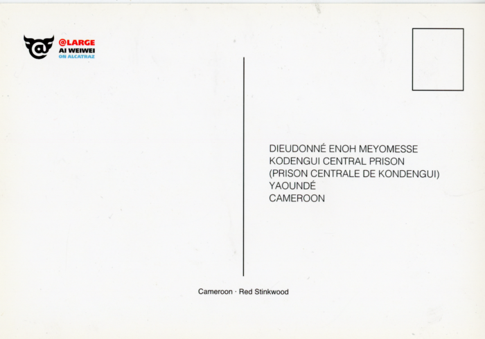 Selection of postcards from among the many that Ai Weiwei published as part of the series At Large: Ai Weiwei on Alcatraz. Each card is addressed to a political prisoner in jails throughout the world. Each card features a plant or bird from the country of the addressed political prisoner. Visitors to the exhibition At Large: Ai Weiwei on Alcatraz were encouraged to take cards, write a message, and mail them to the prisoner.