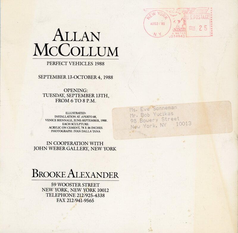Allan McCollum, Perfect Vehicles, Brooke Alexander Inc & John Weber Gallery, Card, 1988