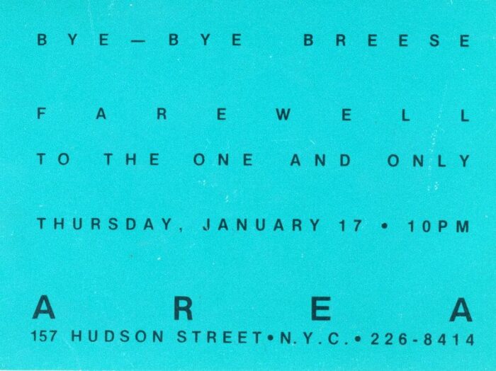 AREA Nightclub, Bye-Bye Breese: Farewell to the One and Only (Doorman Joe Brese), Card with Gold Sticker, January 17, 1985