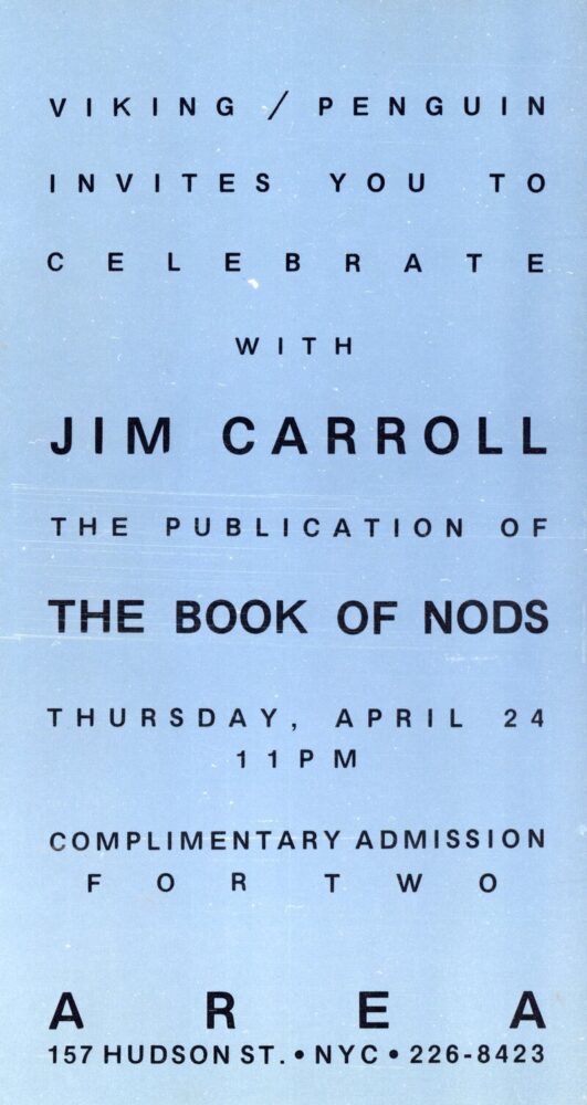 AREA Nightclub, Jim Carroll’s Publication of “The Book of Nods,” Card, April 24, 1986