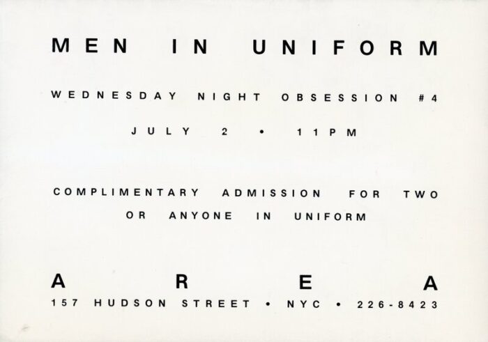 AREA Nightclub, Men in Uniform, Card with Envelope, July 2, 1986