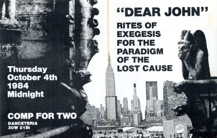 “Dear John” Rites of Exegesis for the Paradigm of the Lost Cause, with Lydia Lunch and Ven Yu, Folded Card, Danceteria, 1984