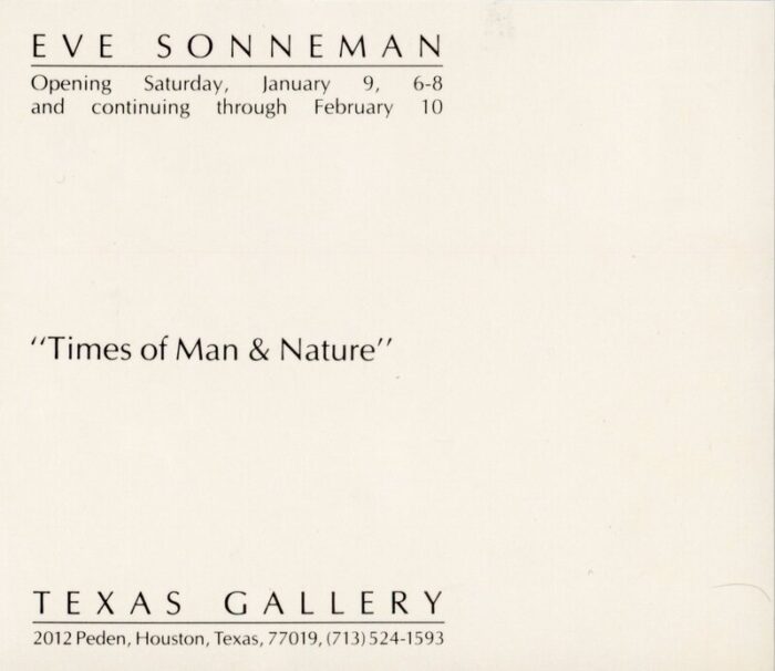 Eve Sonneman, Times of Man & Nature, Texas Gallery, Card, 1982
