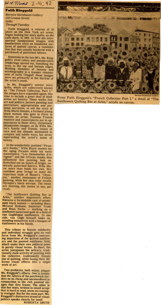 Faith Ringgold, “Sunflowers Quilting Bee at Arles” (1991) From the Exhibition “The French Collection,” Card with Newspaper Clipping and Checklist, Bernice Steinbaum Gallery, 1992