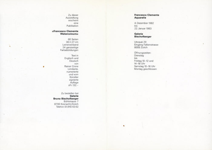Galerie Bruno Bischofberger (Zurich, Switzerland,) Francesco Clemente Watercolors, Photo portrait by Robert Mapplethorpe, Folded Card, December 1982 – January 1983, Size Folded: 5 ¾ x 8 ¼