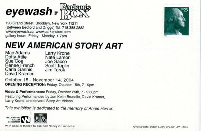 “New American Story Art,” Group Show with Sue Coe, Mac Adams, and Others, Card with Image by Jim Torok, Parker’s Box, 2004