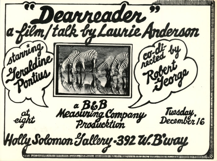 Holly Solomon Gallery, Laurie Anderson, Geraldine Pontius, Robert George, Dearreader, Card, 1975