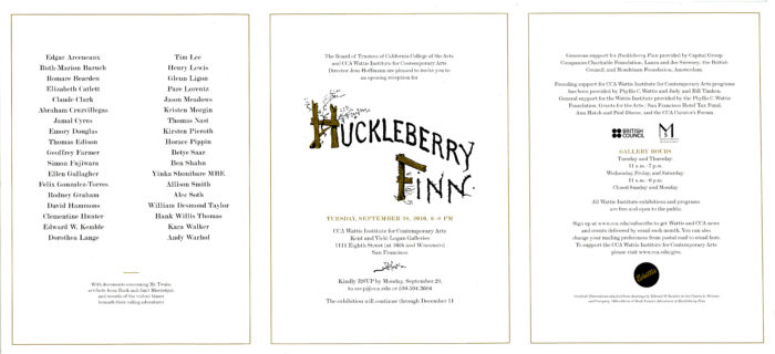 Group Exhibition with Hank Willis Thomas, Kara Walker, David Hammons, Ellen Gallagher, others, Huckleberry Finn, Two-Fold Card, Wattis Institute for Contemporary Arts (California), 2010