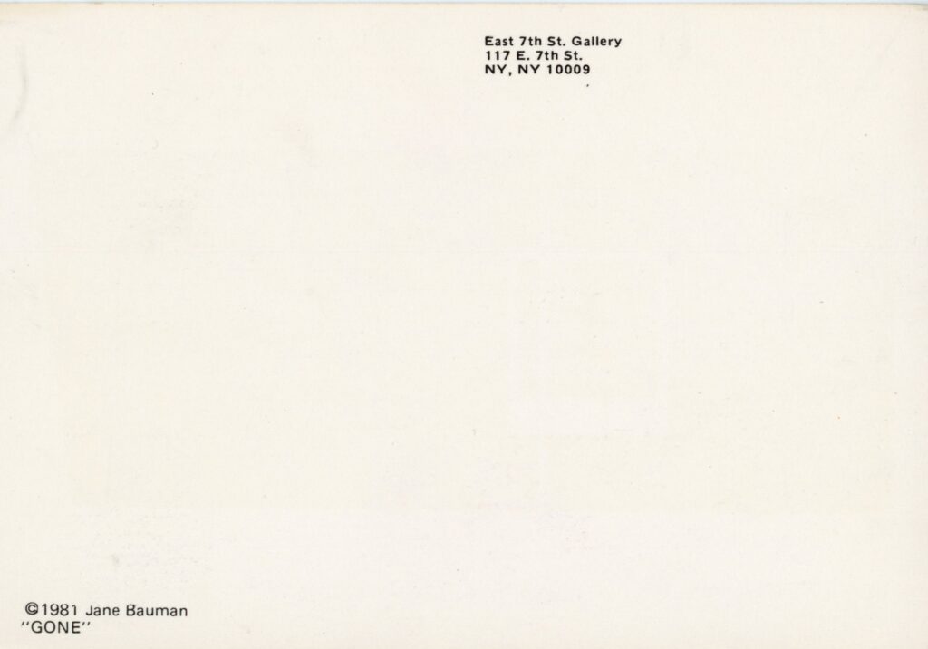 Jane Bauman, Gone, East 7th St. Gallery, Card, 1981
