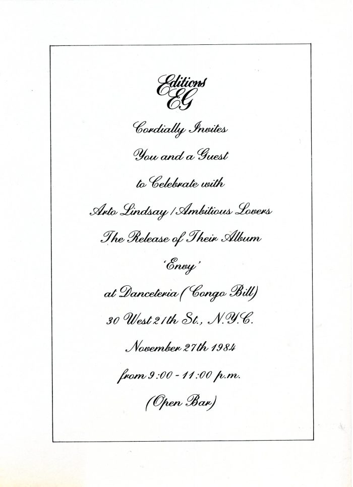 Danceteria, Editions EG (Brian Eno’s Record Company), Release Party for Arto Lindsay/Ambitious Lovers and their album