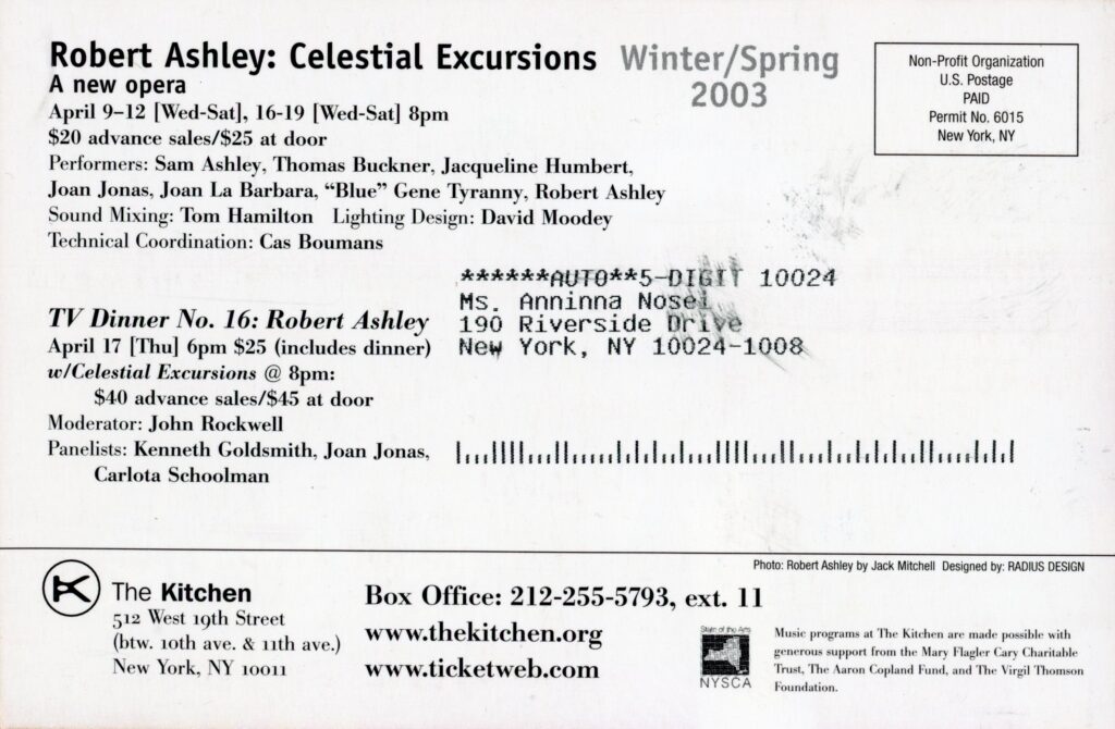 Robert Ashley, Celestial Excursions, The Kitchen, Card, 2003