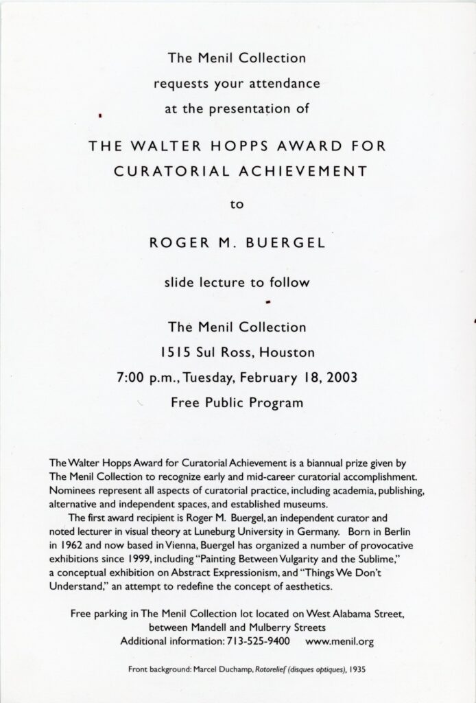 The Walter Hopps Award for Curatorial Achievement presented to Roger M. Buergel, The Menil Collection, Card with Duchamp’s