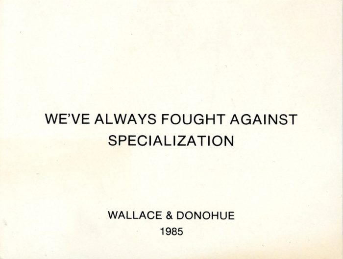 Wallace & Donohue, We’ve Always Fought Against Specialization, Card, 1985