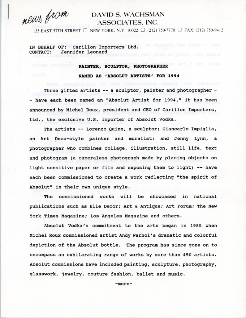 The 4 publicity photographs featured in this press packet include “Absolut Artists Against Aids” – “Absolut Lynn” – “Absolut Impiglia” – “Absolut Lorenzo”