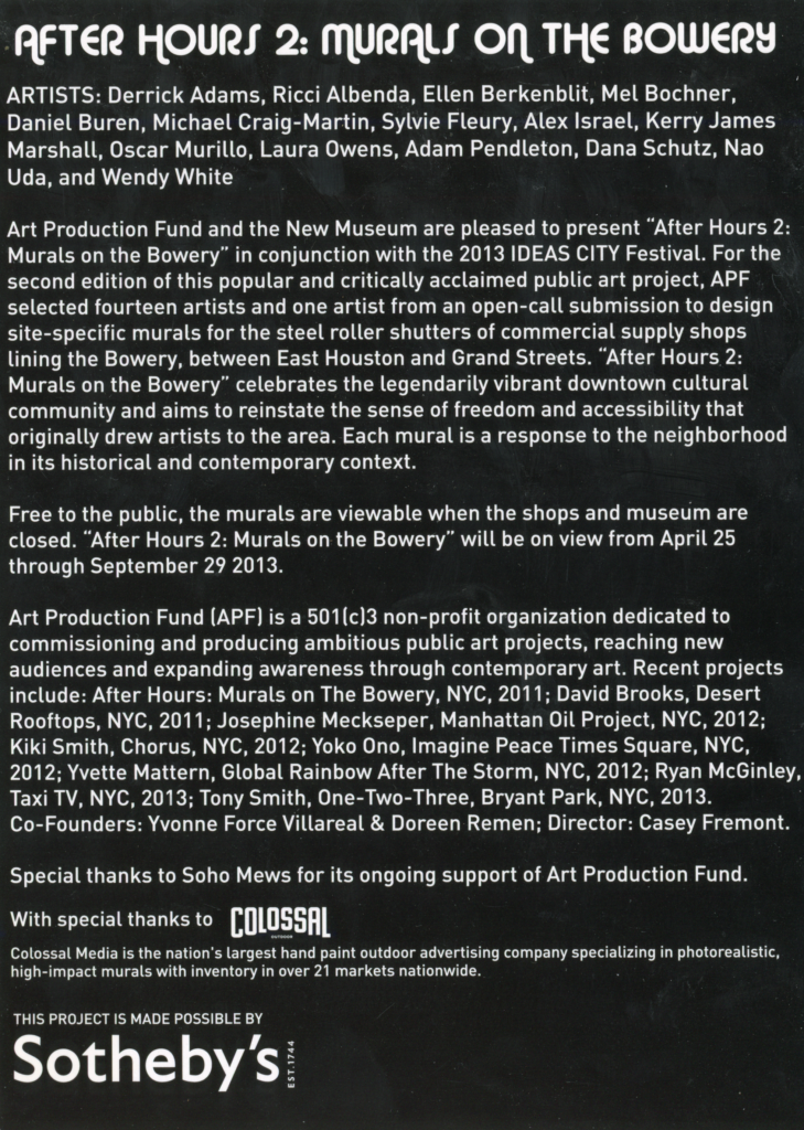 After Hours 2: Murals on the Bowery, with Daniel Buren, Kerry James Marshall, Dana Schutz, Oscar Murillo, Mel Bochner, Art Production Fund & The New Museum, 2013