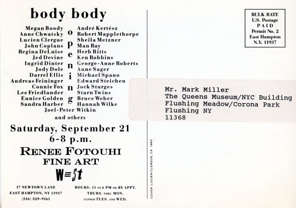 Body Body, Group Show with Lucien Cleruge (Cover), John Coplands, Jock Sturges, Hannah Wilke, Renée Fotouhi Fine Art, Card, 1991