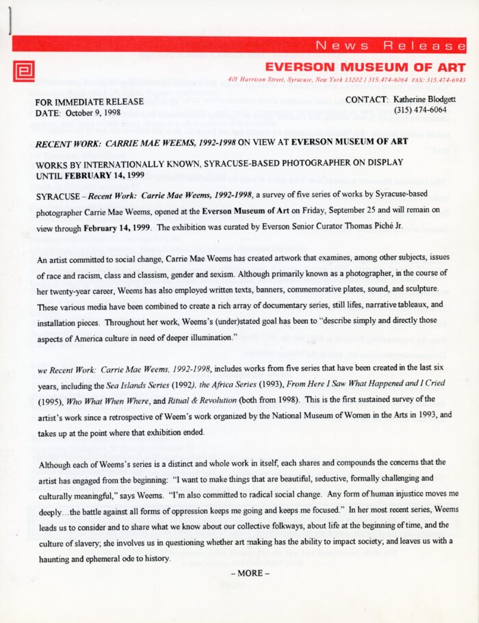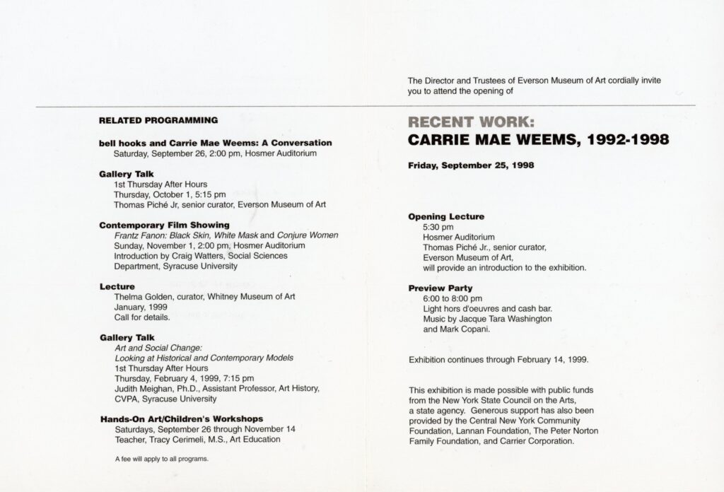 Carrie Mae Weems, Everson Museum of Art, Folded Card with Press Release, 1998