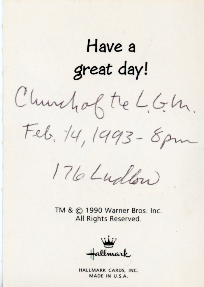 Church of The Little Green Man, Memorial Service for Greg Bershad on Valentine’s Day, Two Cards in Envelope, 1993