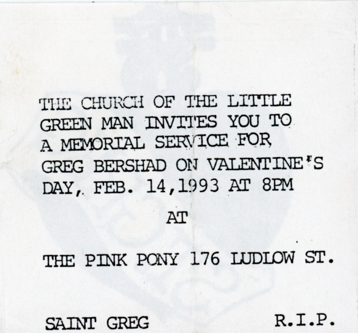 “The Church of the Little Green Man invites you to a Memorial Service for Greg Bershad on Valentine’s Day, Feb. 14, 1993 at 8pm at The Pink Pony.”