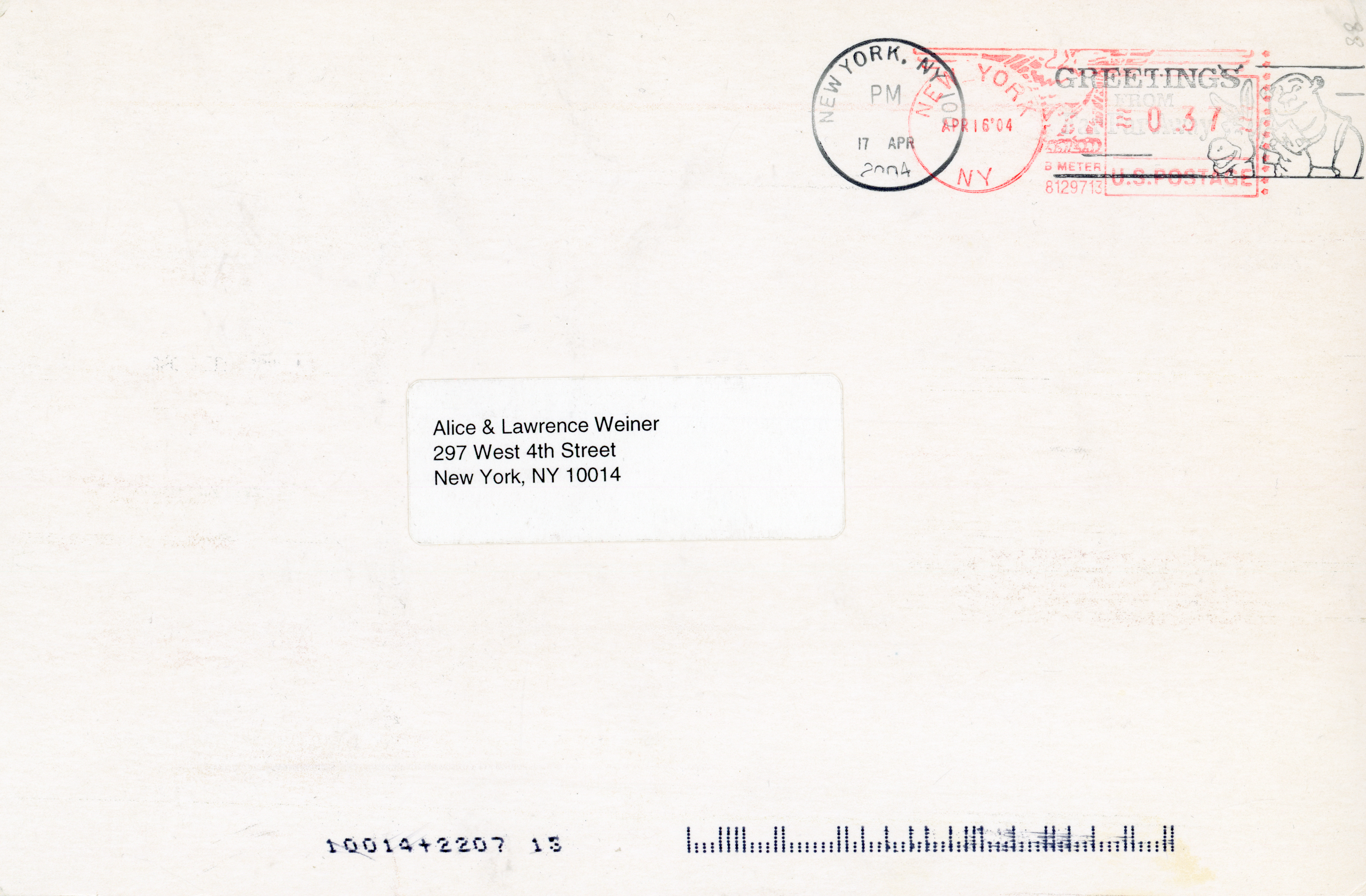 Card addressed to the artist Lawrence Weiner on back.