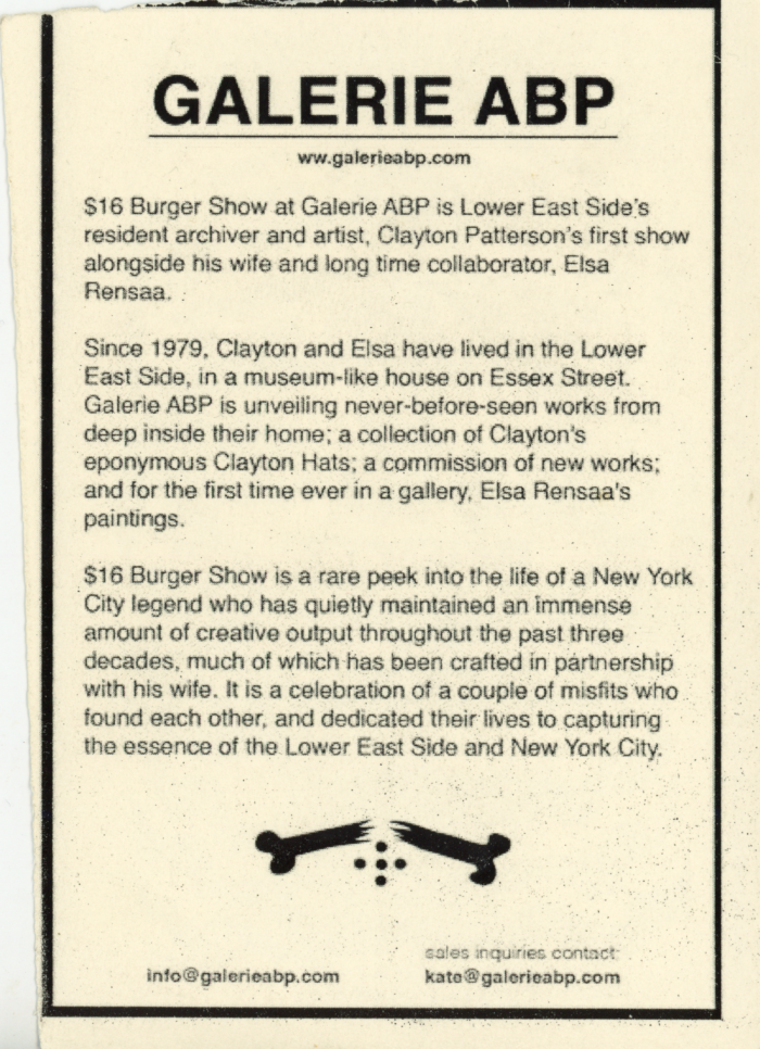 “$16 Burger Show at Galerie ARP is Lower East Side’s resident archiver and artist, Clayton Patterson’s first show alongside his wife and long time collaborator, Elsa Rensaa.”
