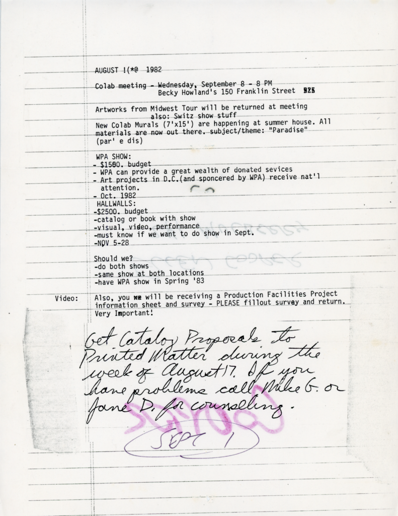 Colab Meeting, August 1982. Becky Howland’s House. Includes discussions about collaborations with the Washington Project for the Arts on the Ritz exhibition, collaborations with Hallwalls in Buffalo, and collaboration with Printed Matter for the Art Direct catalogue.