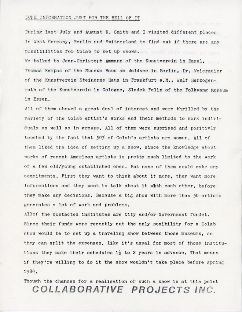 “Some Information just for the Hell of it”: Christof Kohlhofer reports about a trip that he and Kiki Smith took to Europe and the interest expressed in Colab and potential collaborations on exhibitions.
