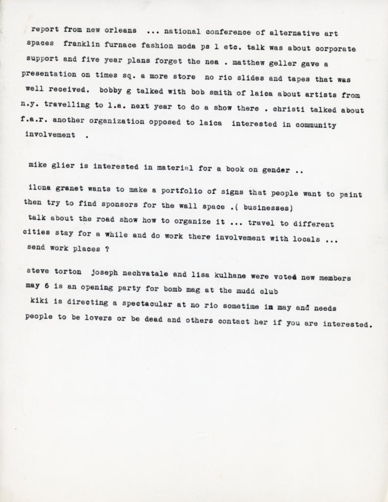 Colab Meeting, April 21, 1981. Ilona Granet’s House. Topics include Exhibition in Geneva, Bomb Magazine awarded $600, Torton Nechvatal and Kahane were voted new members.