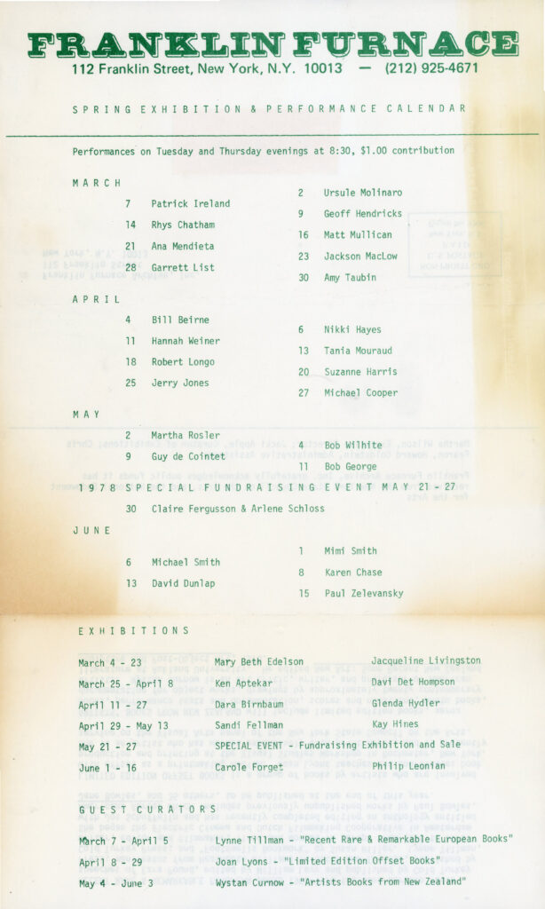 Franklin Furnace, Spring Exhibition & Performance Calendar, with Ana Mendieta, Robert Longo, Martha Rosler, Mary Beth Edelson, Lynne Tillman, and others, Two-Fold Flyer, 1978