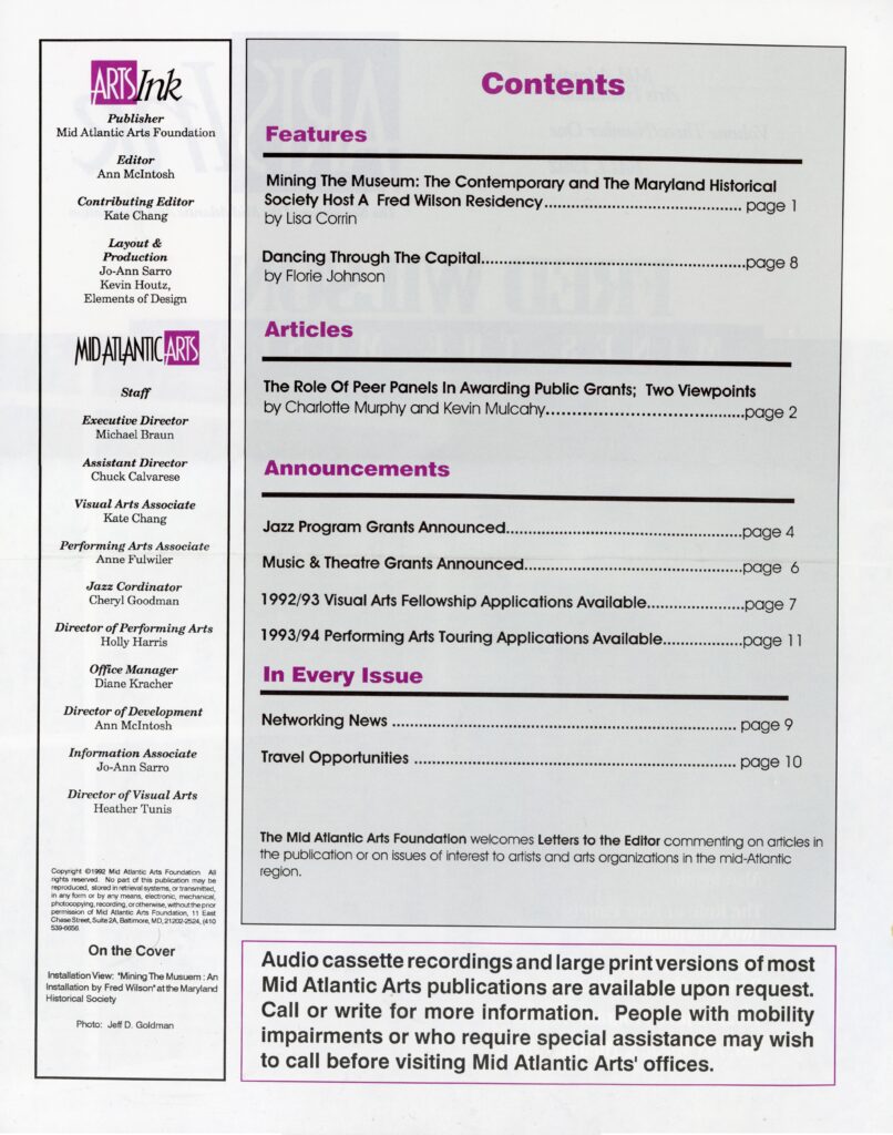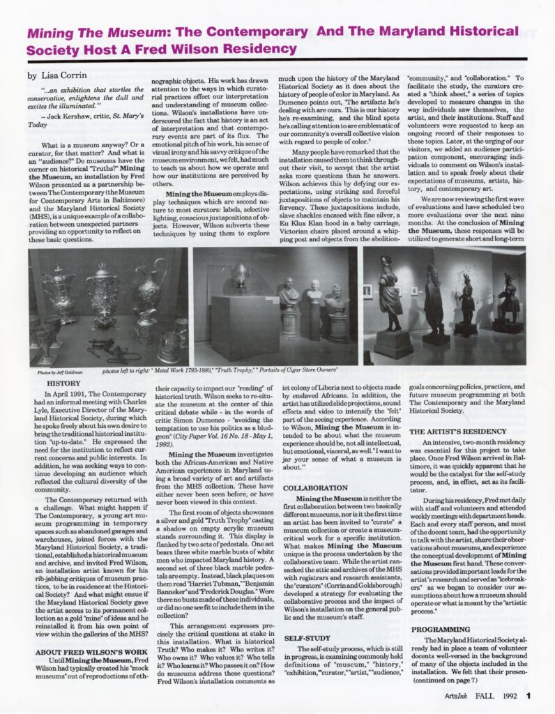 Fred Wilson Mines The Museum, Arts Ink: The Newsletter of the Mid Atlantic Arts Foundation, 9-Page Newsletter, 1992