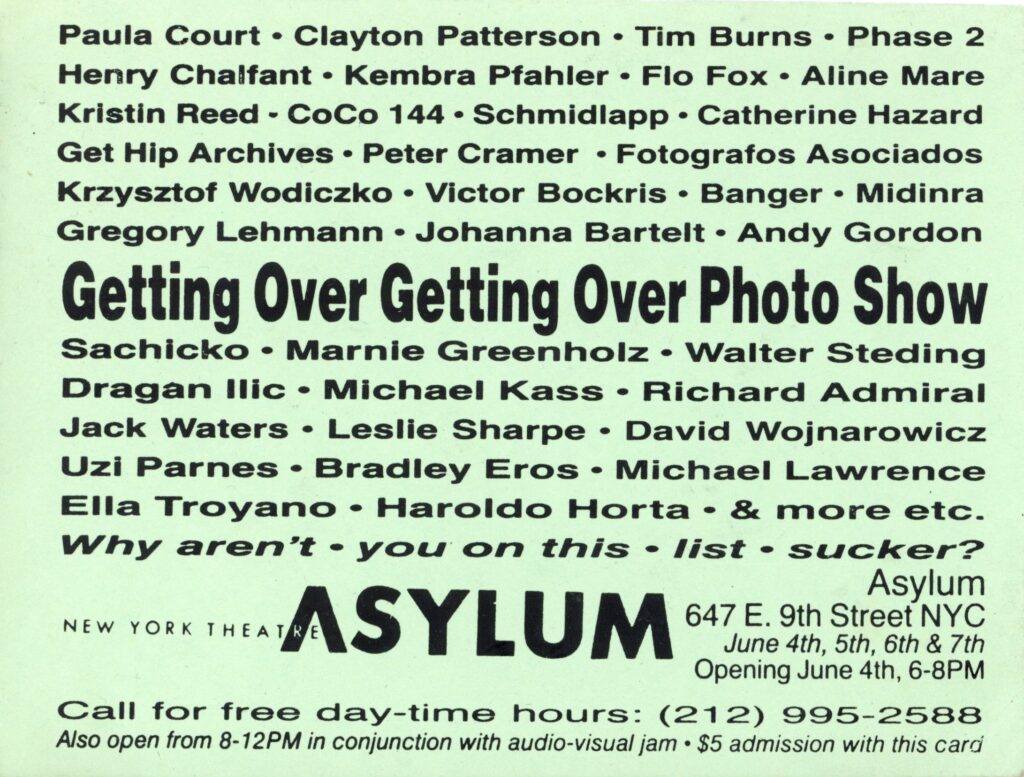 Getting Over Getting Over Photo Show, Group Exhibition with David Wojnarowicz, Kemba Pfahler, Phase 2, and others, Asylum, Card, Undated c. 1980s