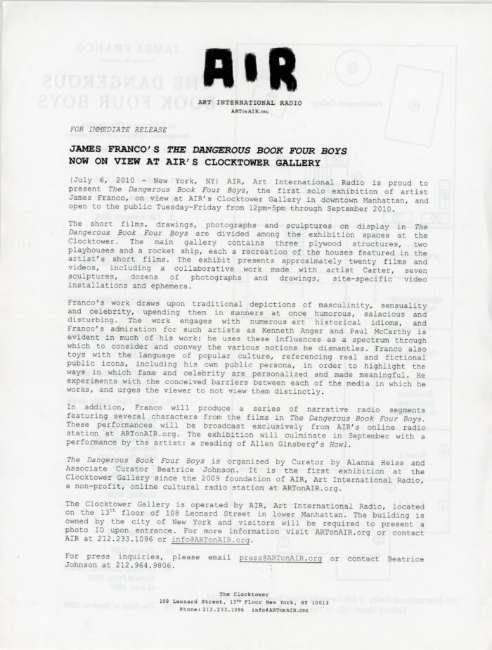 James Franco, The Dangerous Book Four Boys, Clocktower, Folded Card and Press Release, 2010