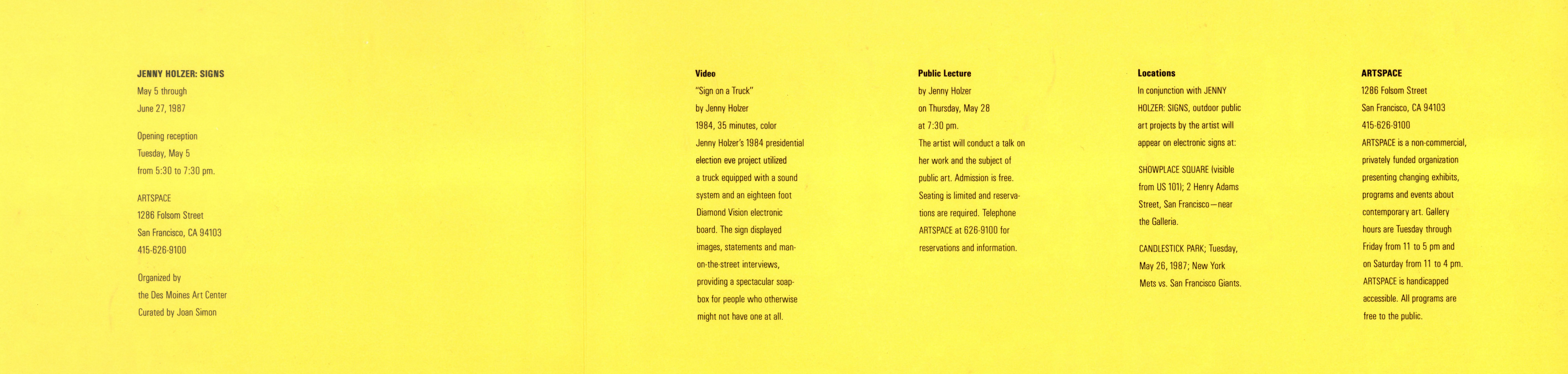 Jenny Holzer, Public Art Project at Candlestick Park’s Jumbo TRON Video Board (San Fransisco), ARTSPACE & The San Fransisco Giants, Handout, 1987