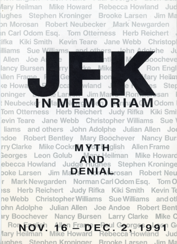 JFK in Memoriam: Myth and Denial, Group Exhibition with Jim Marrs (Photo), Nancy Burson, Tom Otterness, Sue Williams, B4A Gallery, Card, 1992